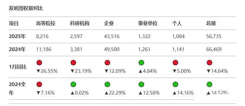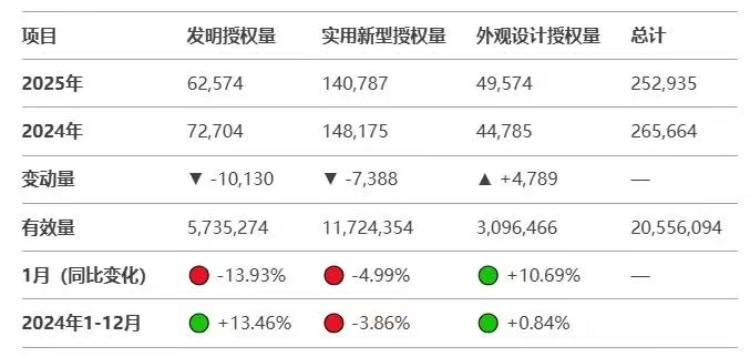 2025 年 1 月知識產(chǎn)權(quán)主要統(tǒng)計(jì)數(shù)據(jù)于國家知識產(chǎn)權(quán)局網(wǎng)站公布,與 2024 年同期相比,數(shù)據(jù)呈現(xiàn)出不同的變化趨勢: