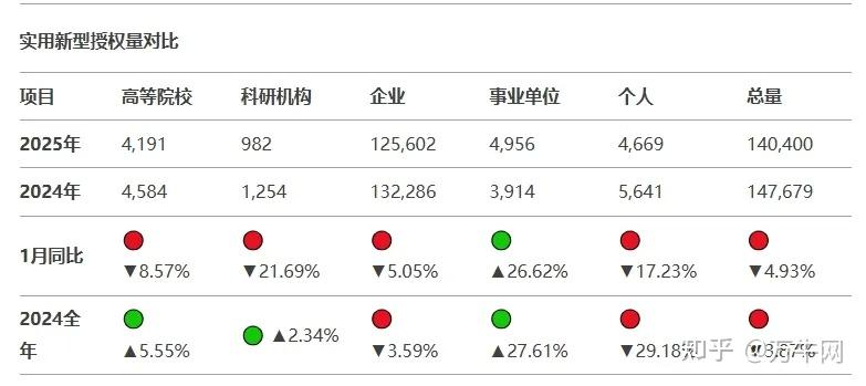 2025 年 1 月,國內(nèi)專利授權(quán)量按照專利權(quán)人類型進(jìn)行分類統(tǒng)計(jì)后,呈現(xiàn)出較為明顯的差異。其中,僅事業(yè)單位的實(shí)用新型專利授權(quán)量處于上升態(tài)勢,而其他四類專利權(quán)人的實(shí)用新型專利授權(quán)量均有所下降。具體數(shù)據(jù)為:個(gè)人類型的實(shí)用新型授權(quán)量下降幅度達(dá) 17.23%;科研機(jī)構(gòu)的實(shí)用新型授權(quán)量下降 21.69%;企業(yè)的實(shí)用新型授權(quán)量下降 5.05% 。